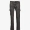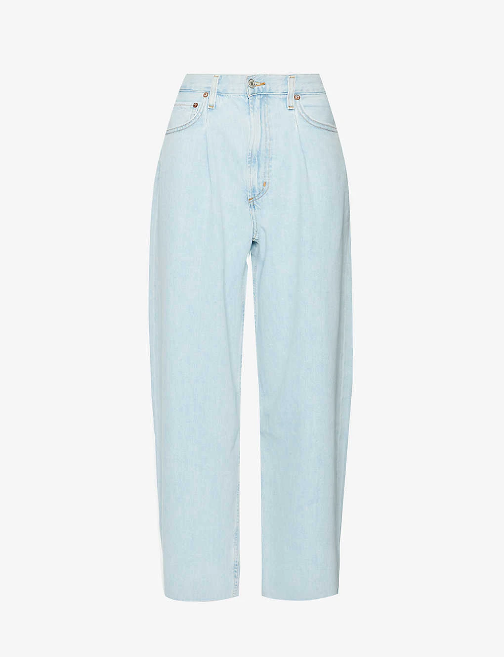 - Relaxed-fit, high-rise, belt loops, five pockets, all-over faded wash and pleated panels, V-shaped yoke at back, branded patch at back, partially lined, raw hems