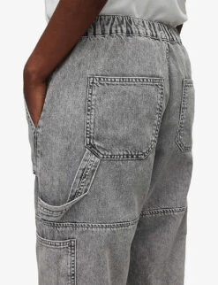 - Straight leg, high-rise, relaxed fit, faded wash, exposed stitching, patch pockets, elasticated cuffs