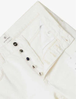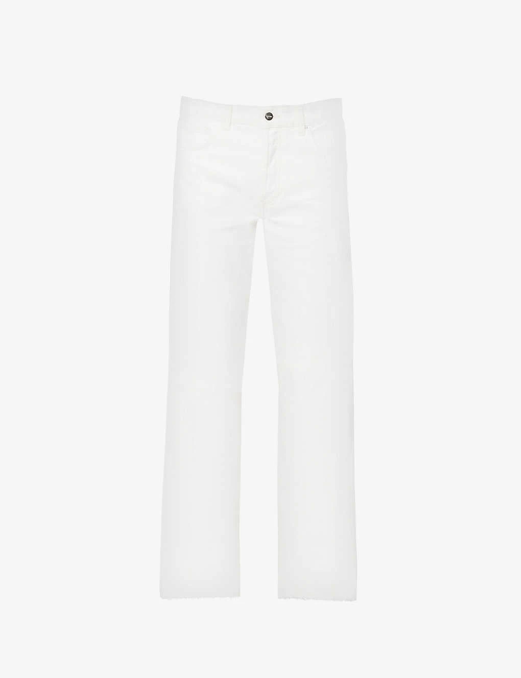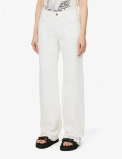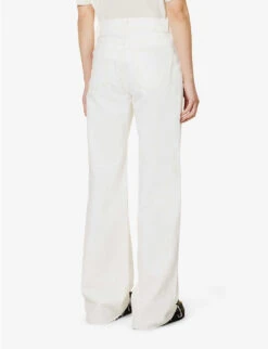 - Regular-fit, high-rise, wide leg, belt loops, five pockets, pressed creases at front and back, branded silver-toned hardware, all-over twill texture, debossed brand patch at back, wide V-shaped yoke at back, fully lined, raw hems