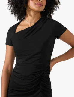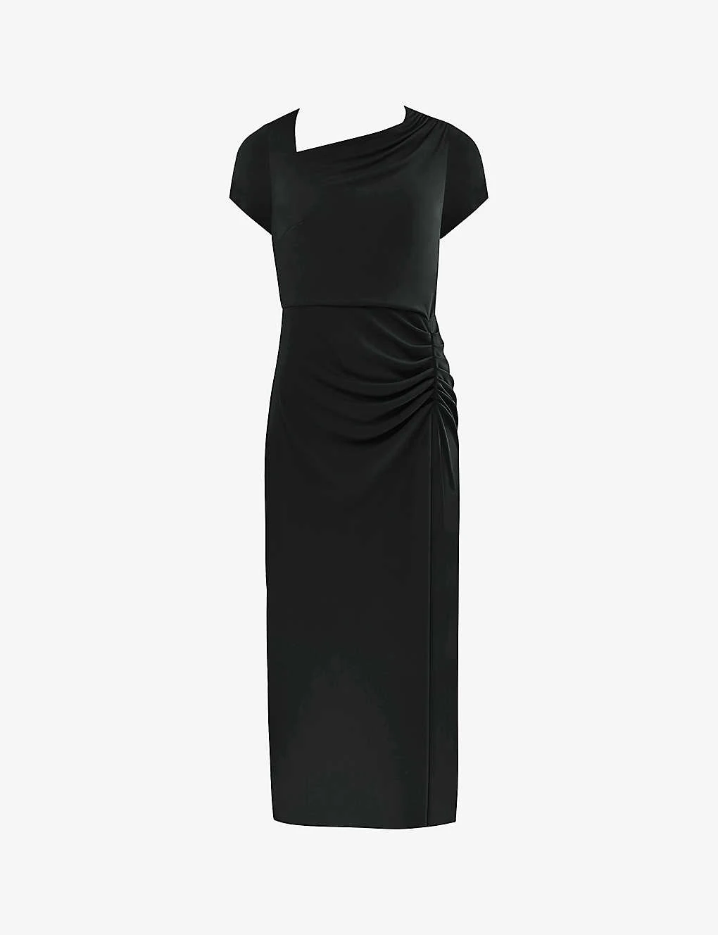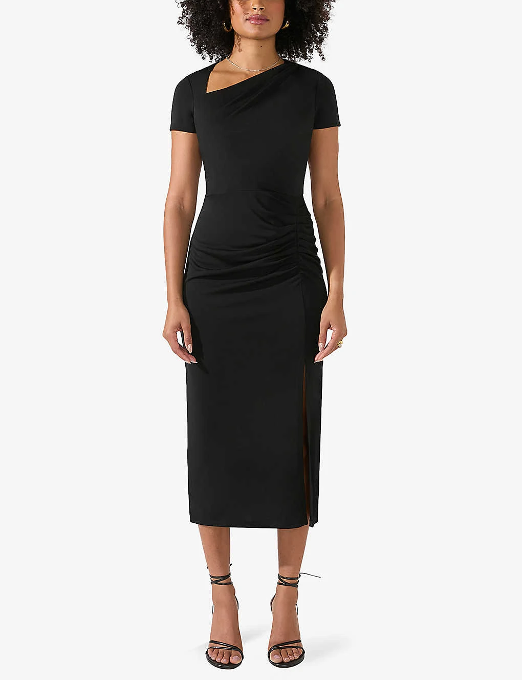 - Asymmetric neckline, cap sleeves, gather-detail at the waist, leg-split detail, midi length
