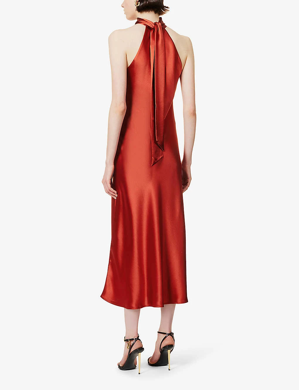 - Midi length, slim fit, halter neck, panel at collar, cut-out at back, darts at bust