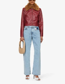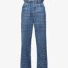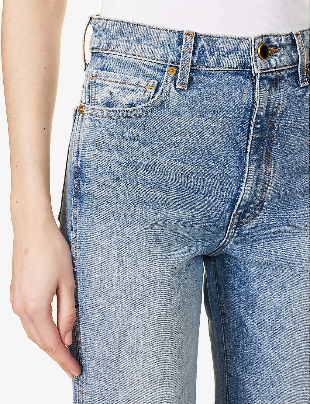 - Regular fit, high-rise, straight leg, structured waistband with belt loops, five pockets, curved yoke at back, contrast stitching, faded wash, gold-toned hardware
