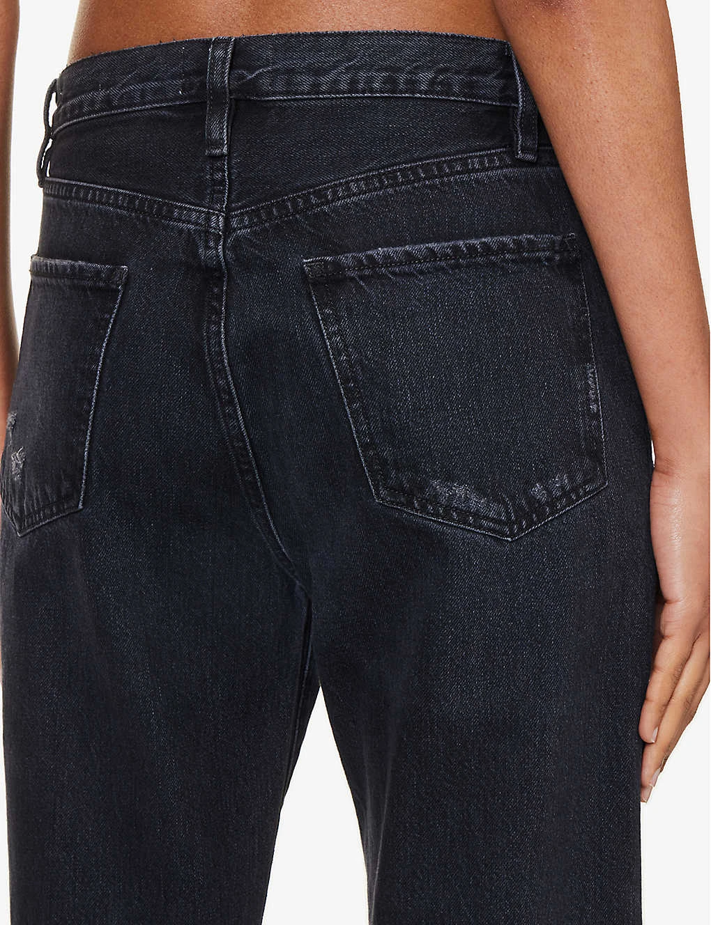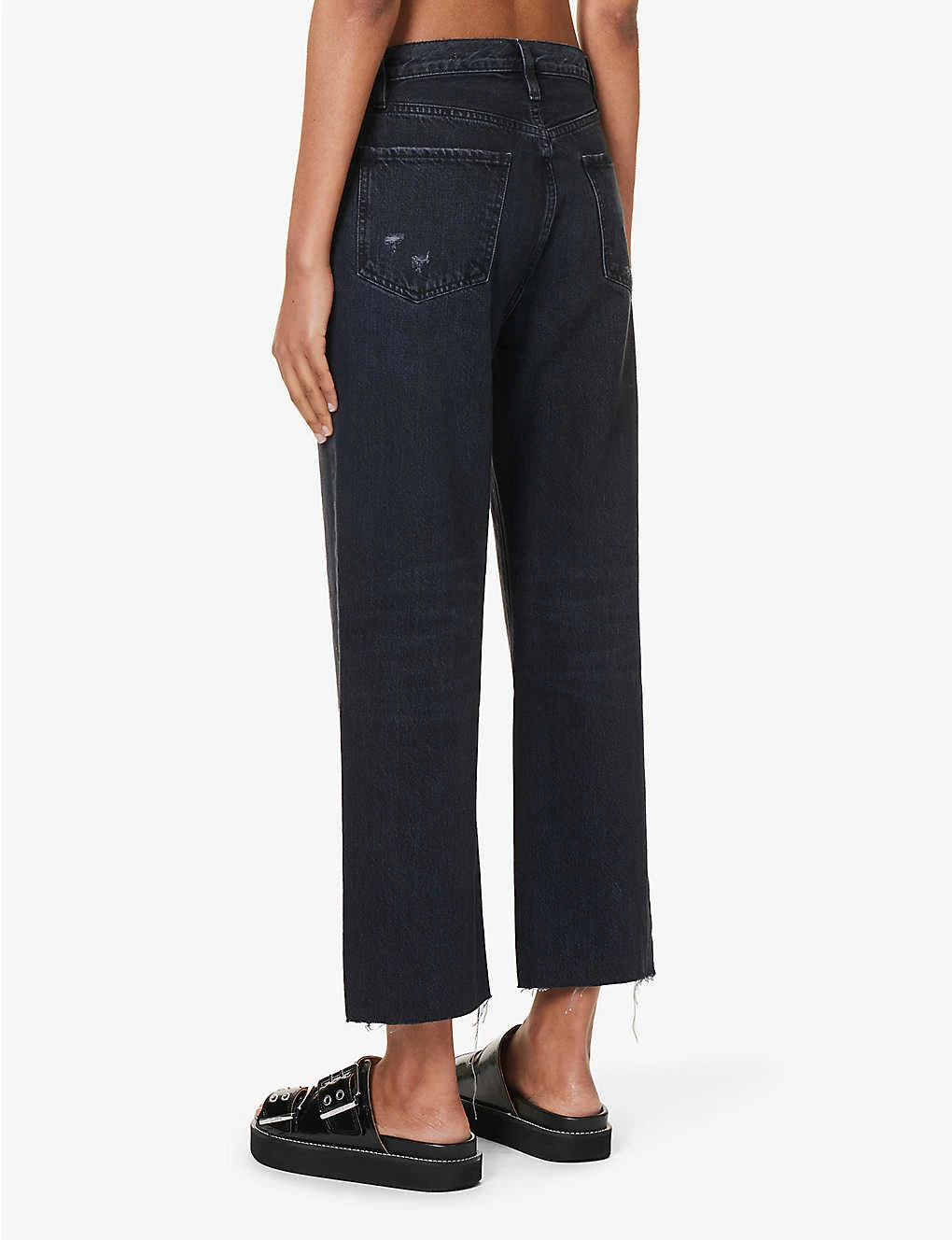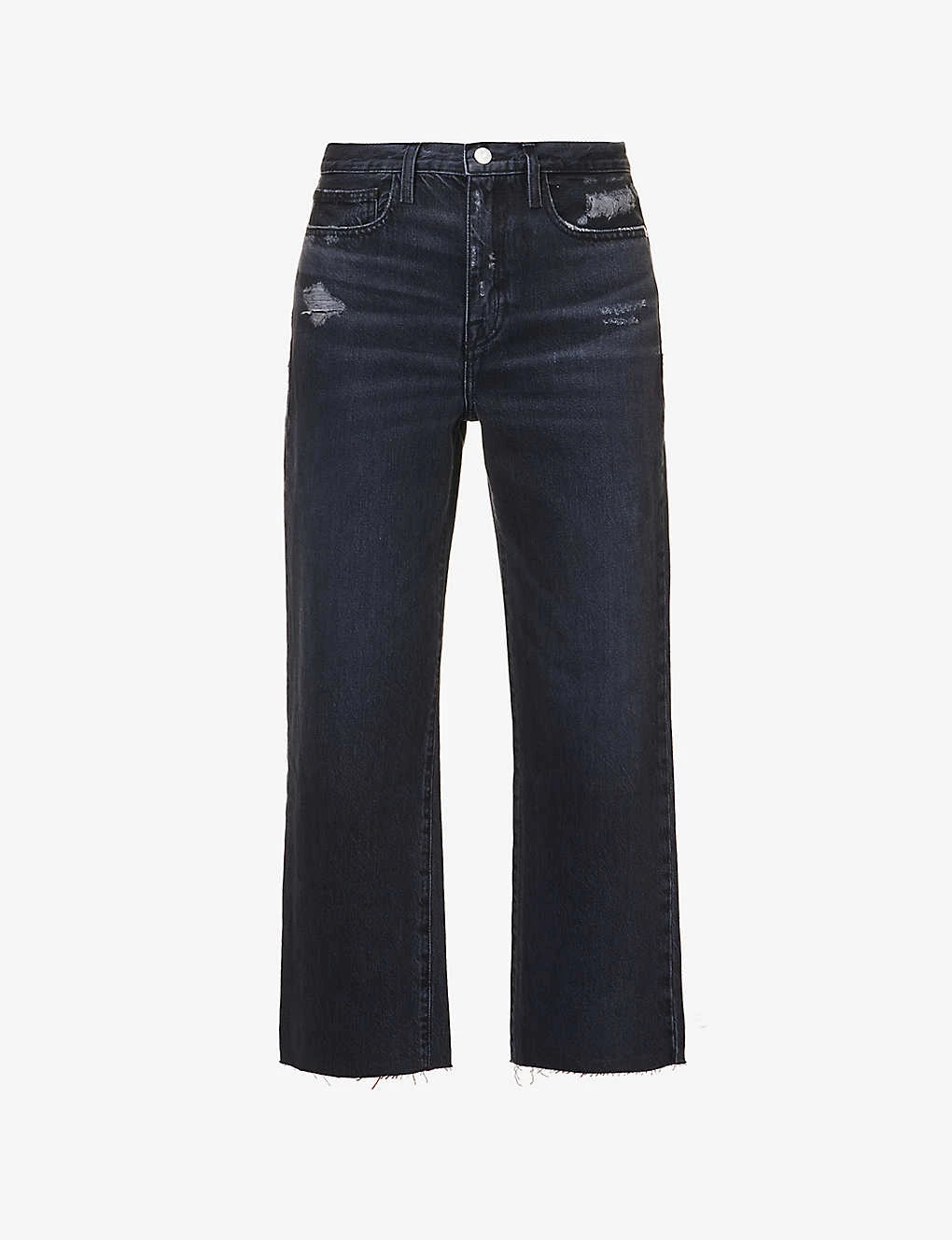 - Regular fit, high rise, straight cropped leg, structured waistband with belt loops, V-shaped yoke at back, faded wash, distressed patches, branded silver-toned hardware, raw hems