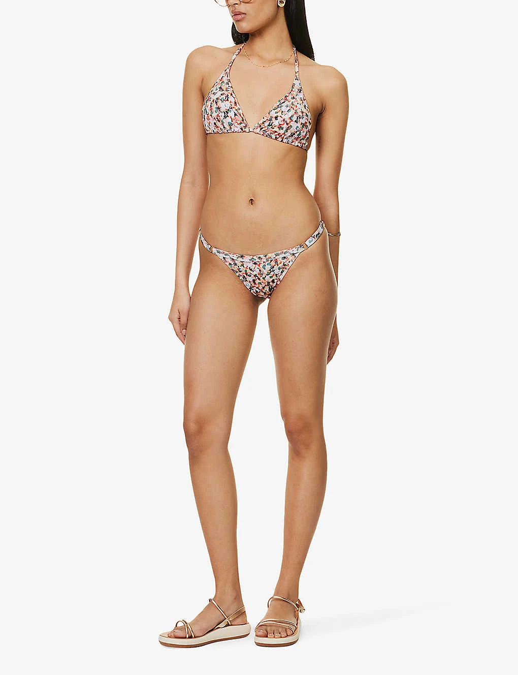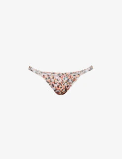 - Mid-rise, high leg, adjustable waistband, low coverage at back, all-over graphic pattern, fully lined