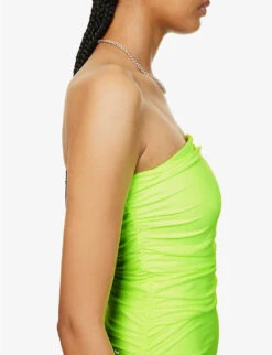 - Slim fit, bandeau neckline, strapless, all-over ruched pattern, scuba texture, lined