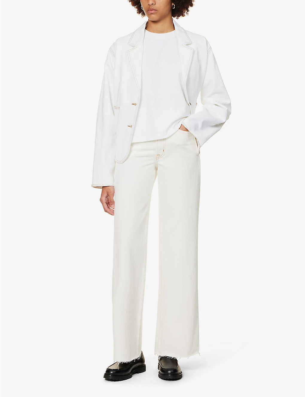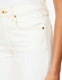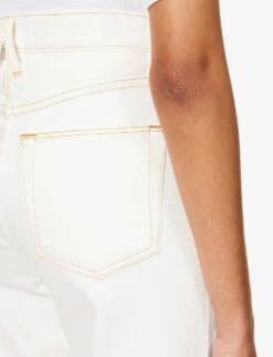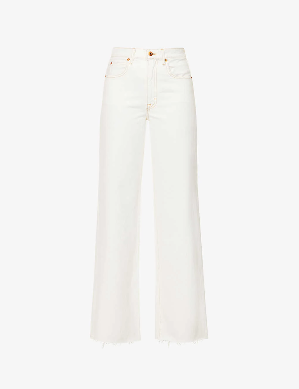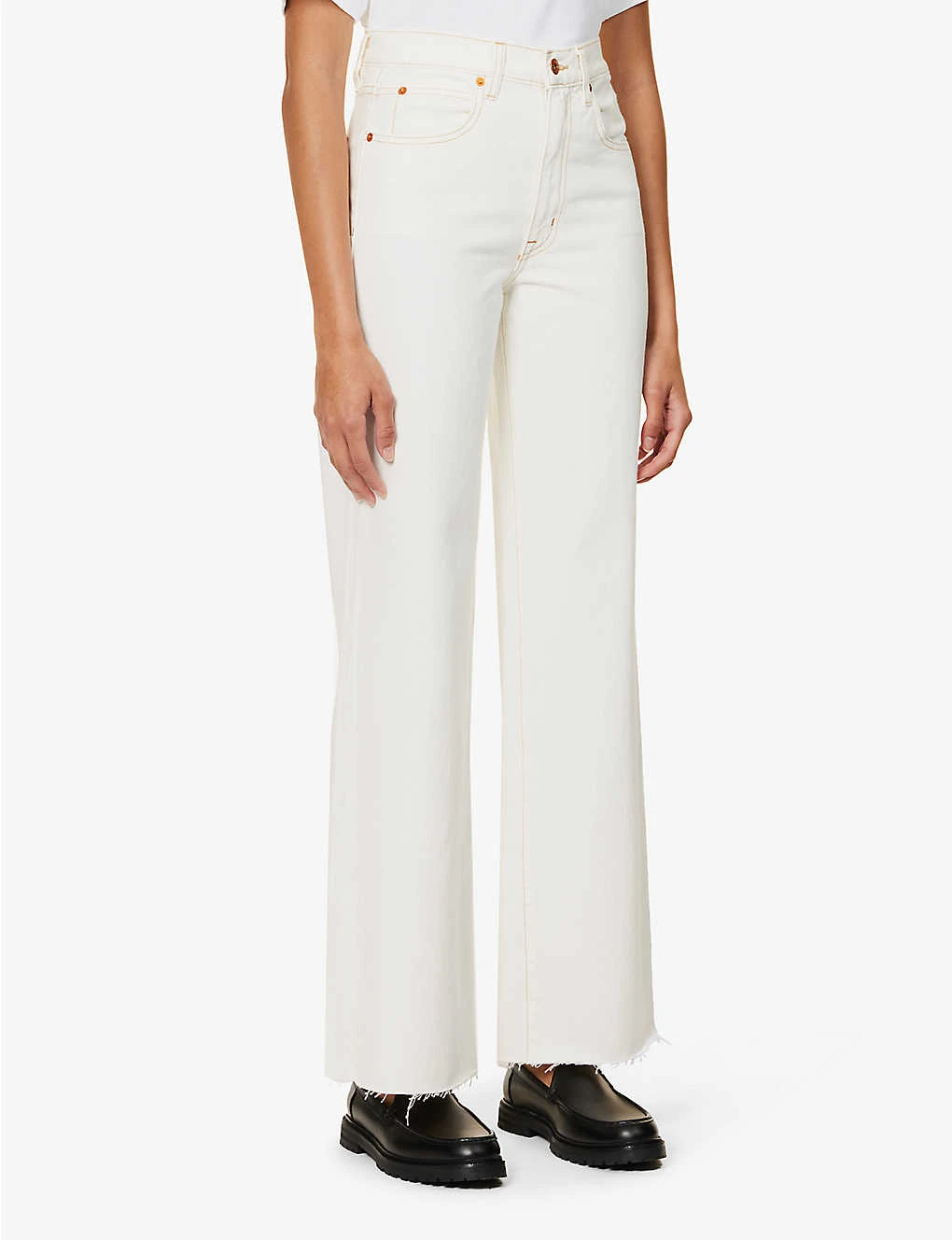 - Regular fit, mid-rise, wide leg, belt loops, five pockets, contrast stitching, branded hardware, frayed cuffs
