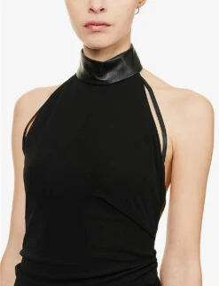 - Slim fit, high choker neck, sleeveless, open back, gathered pattern, contrast panels, split hem