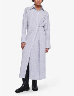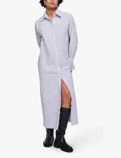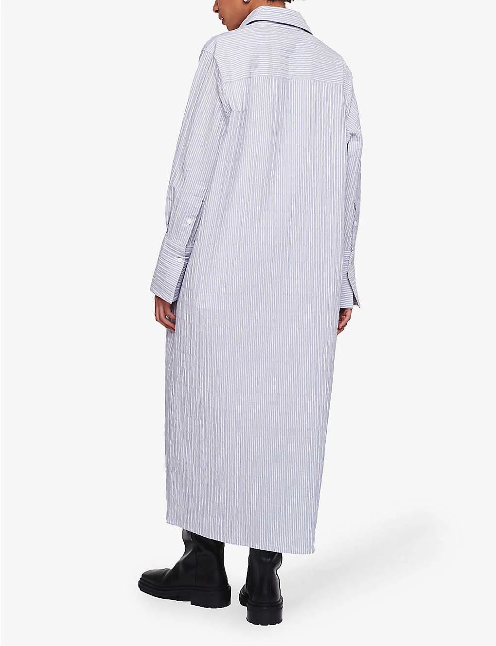 - All-over striped design, oversized fit, wrap-over front, centre yolk, deep cuff, shirt collar with stand
