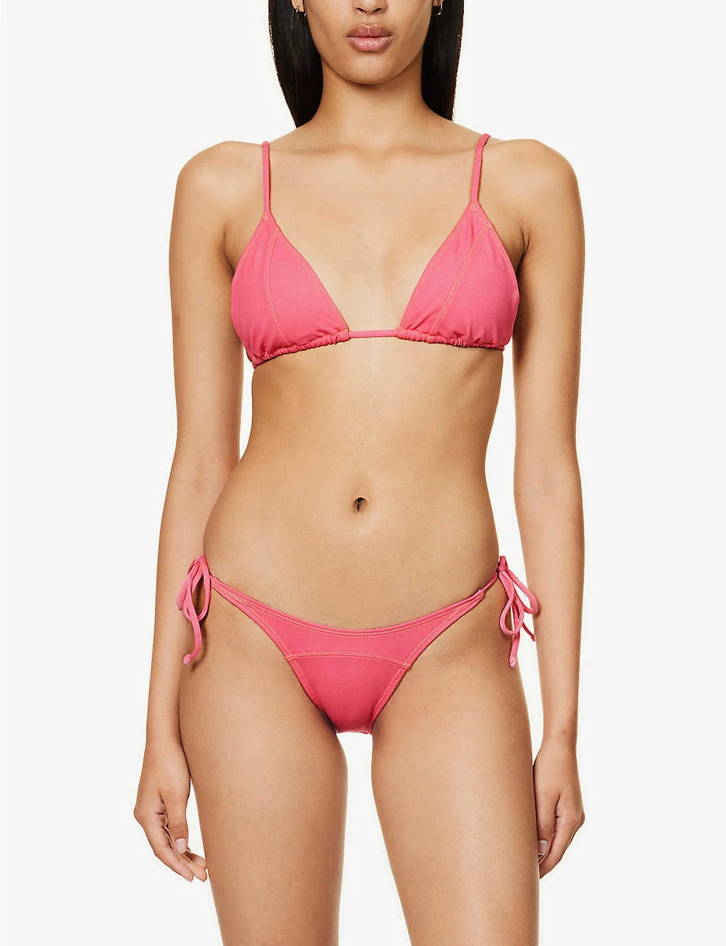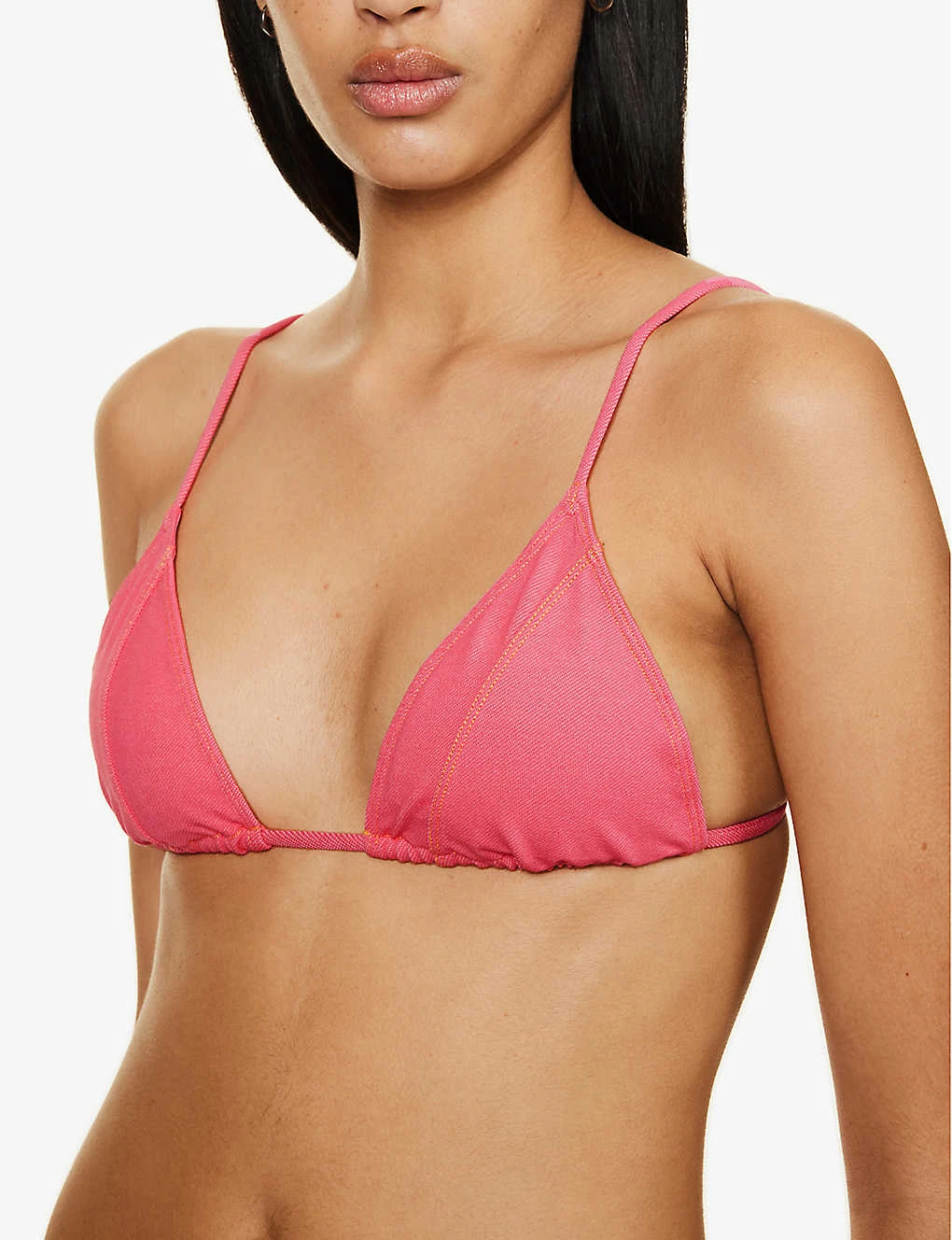 - Adjustable straps, plunge neck, triangle cups, detachable padding, denim effect, lined