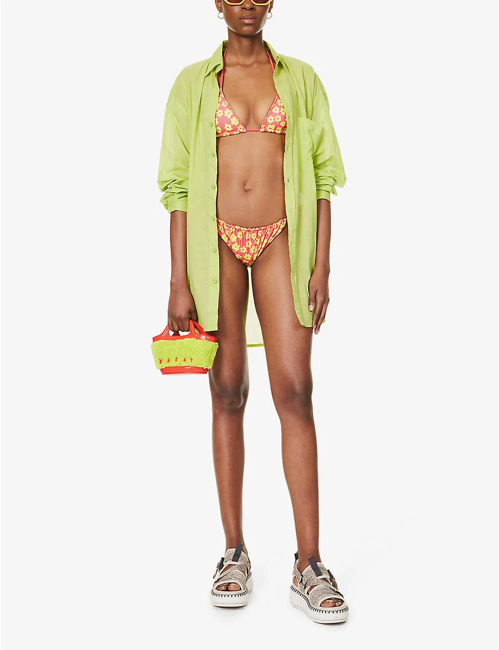 - Mid-rise, elasticated waistband, high leg, self-tie with beads at sides, all-over floral design