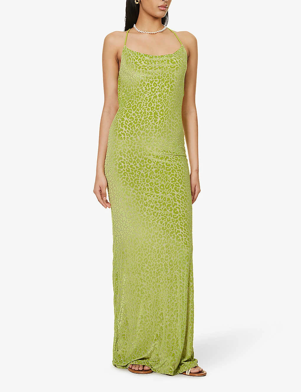Leopard-print Cowl-neck Mesh Maxi Dress