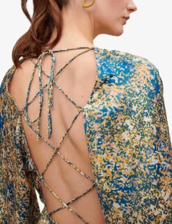 - Plunge V-neck, long balloon sleeves, tiered skirt, front split hem, open back, adjustable criss-cross back ties, all-over abstract print, asymmetric hem