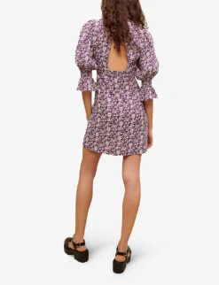 - Round neck, short puff fluted sleeves, all-over floral print, mini skirt, cut-out back, shirred panel at back waistband