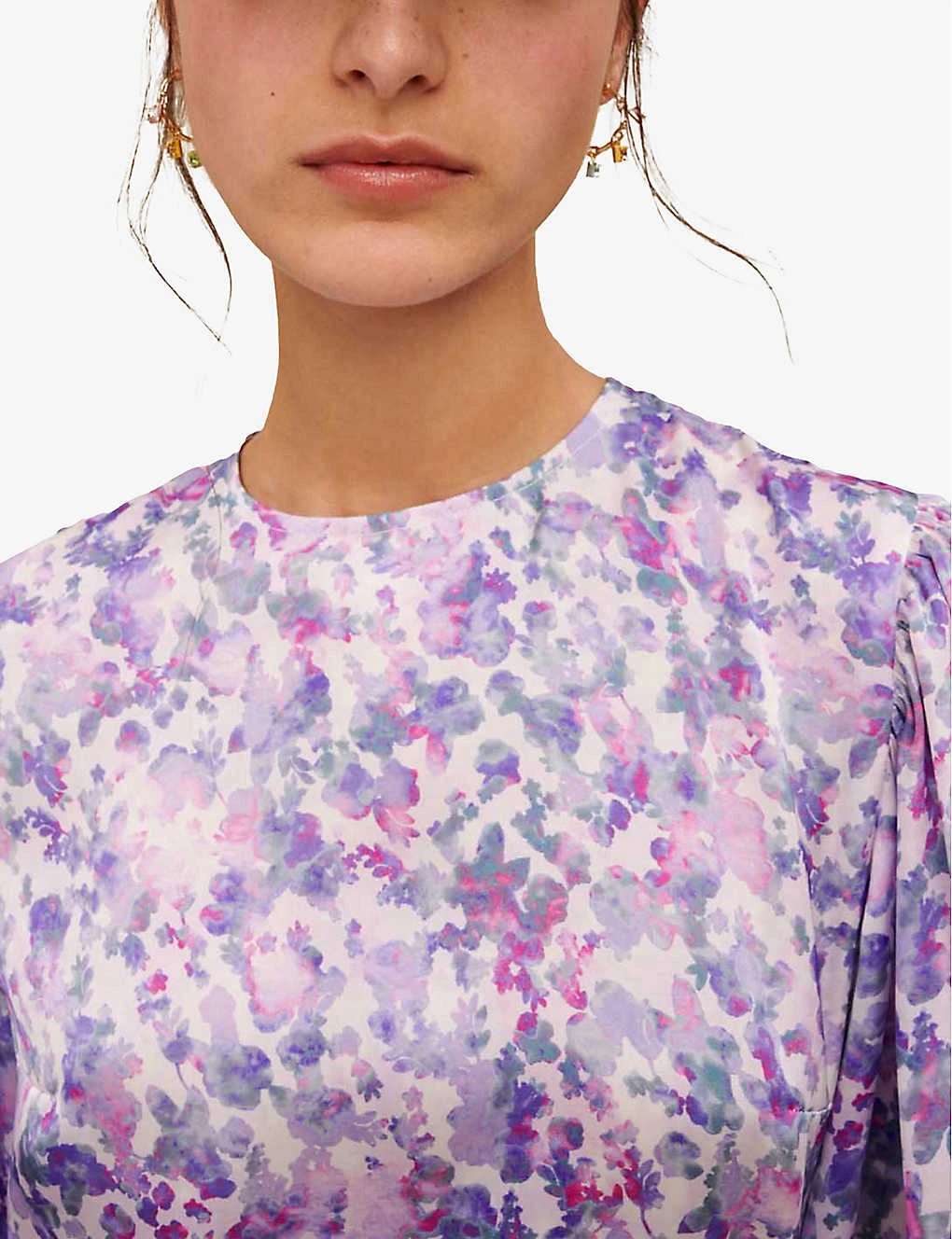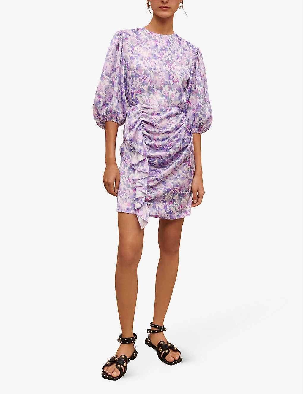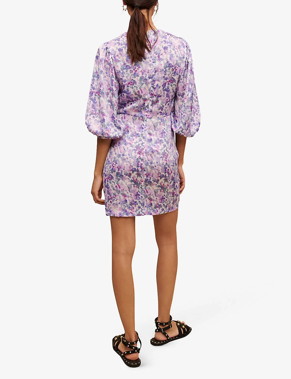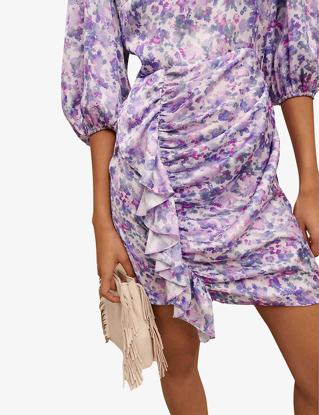 - Slim fit, short balloon sleeves, round neck, elasticated cuffs, all-over floral print, draped skirt, mini length, ruffled trim, asymmetric hem