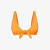 - Triangle cups, scallop trims, padded cups, removable pads, textured, open strappy back