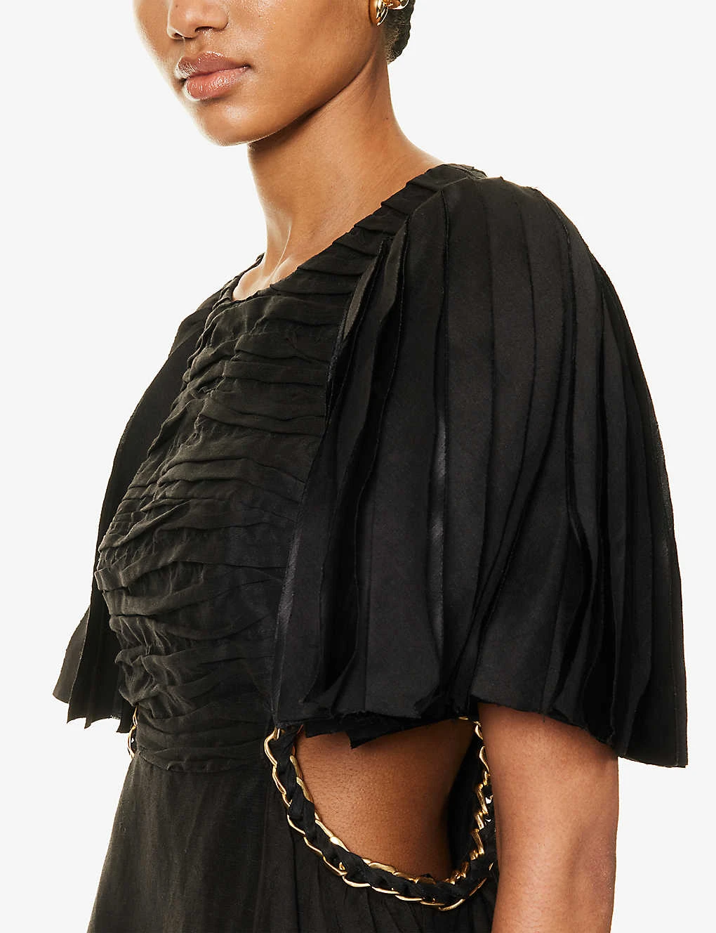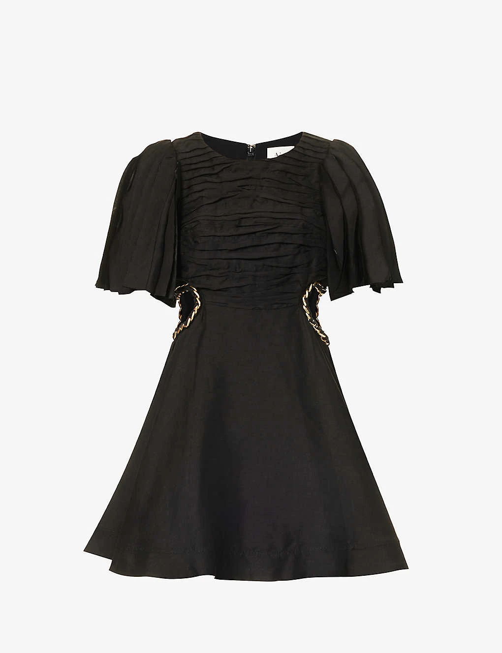 - Regular fit, round neckline, short sleeves, layered panels at sleeves, pleated bodice, cut-out panels at sides, gold-toned chain trim at sides, two slip pockets at front, crosshatch woven texture, flared hem, lined