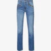 - Slim-fit, high-rise, skinny leg, belt loops, belt loops, five pockets, branded silver-toned hardware, all-over signature contrast panels, faded wash, debossed brand patch at back, signature yoke at back, partially lined, split hems