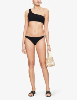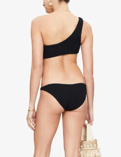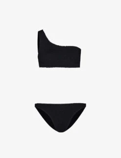 Hunza G bikiniDetails:Top:Straight-across necklineOne shoulder strapAll-over textured patternSlips onBottoms:Mid riseElasticated waistbandAll-over textured patternSlips onFabric:88% nylon, 12% elastaneMidweight, stretchySize & Fit:True to sizeCut to a regular fitCare:Hand wash