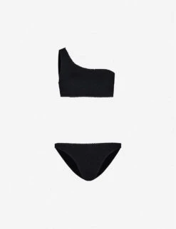 Hunza G bikiniDetails:Top:Straight-across necklineOne shoulder strapAll-over textured patternSlips onBottoms:Mid riseElasticated waistbandAll-over textured patternSlips onFabric:88% nylon, 12% elastaneMidweight, stretchySize & Fit:True to sizeCut to a regular fitCare:Hand wash