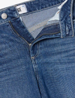 - Boyfriend fit, high rise, slim leg, five pockets, branded hardware, distressed and faded wash, brand patch at back, V-shaped yoke at back, partially lined, cropped, raw folded cuffs