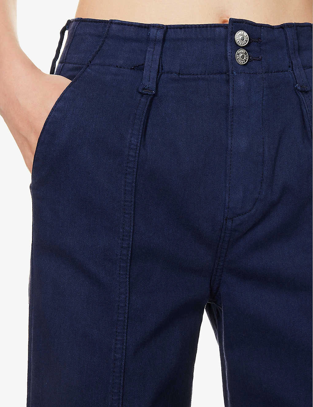 - Exposed button and concealed zip-fly fastening at front