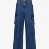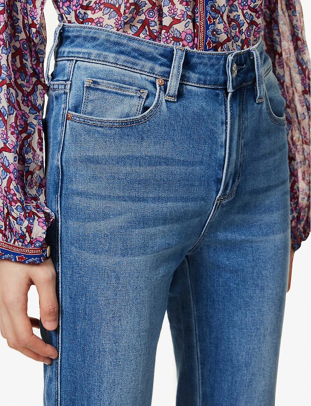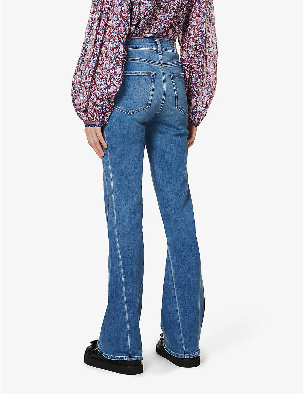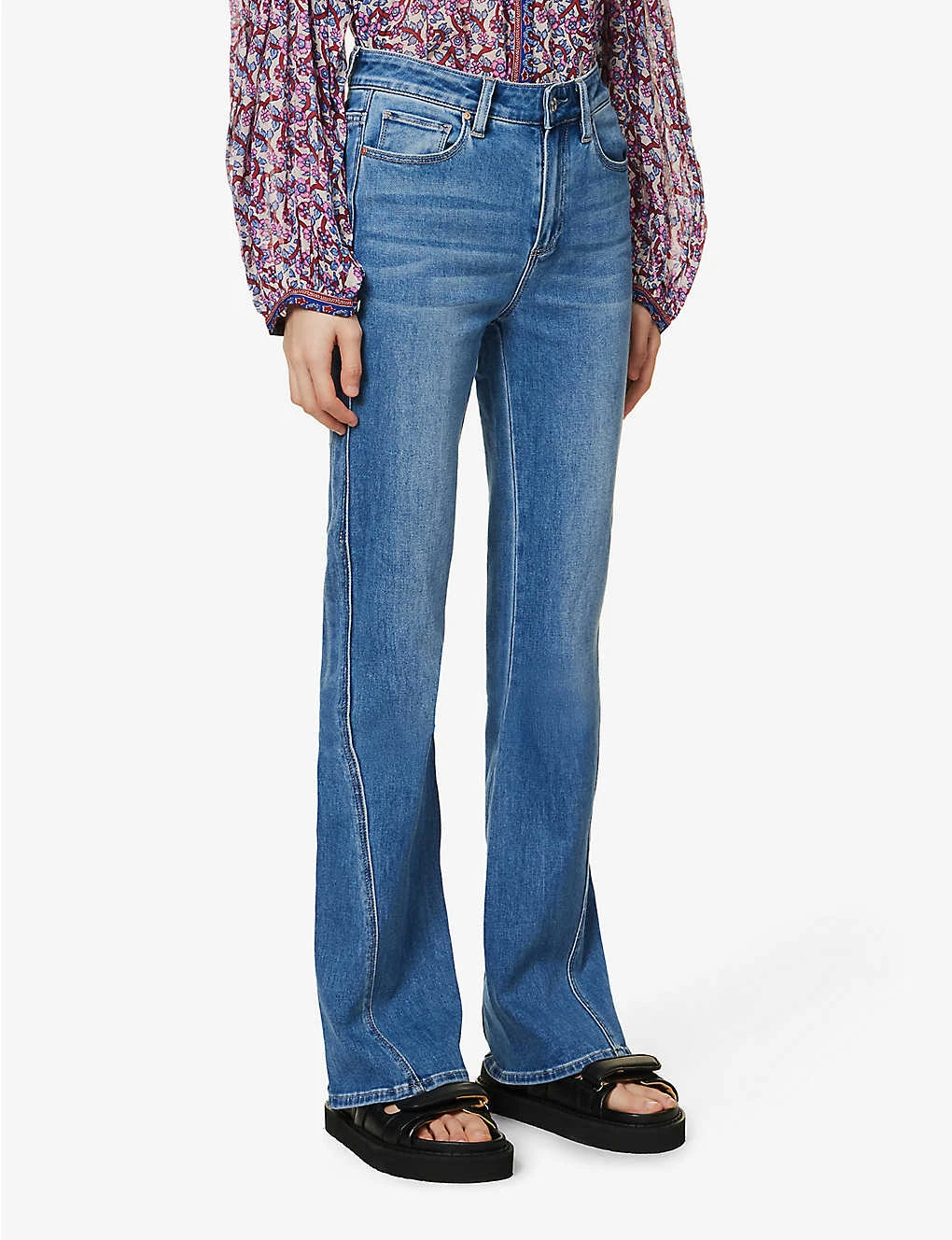 - Regular fit, high rise, bootcut leg, structured waistband with belt loops, five pockets, brand patch at back, curved yoke at back, contrast stitching, mid-wash, branded silver-toned hardware