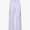 - Regular fit, high-rise, bootcut leg, structured waistband, belt loops, five pockets, V-shaped yoke at back, brand patch at back, contrast stitching, light-faded wash, branded silver-toned hardware, distressed patches, raw hems