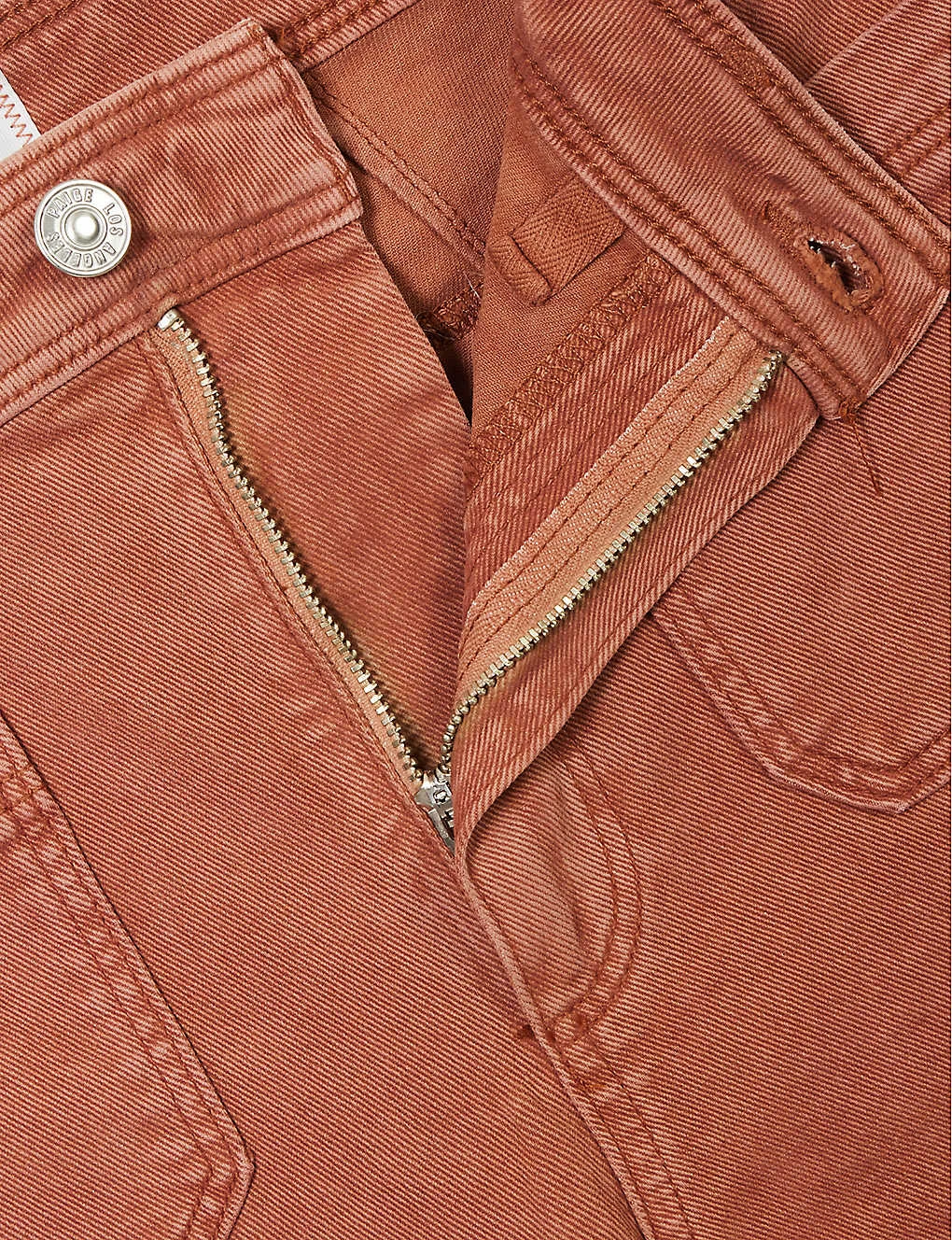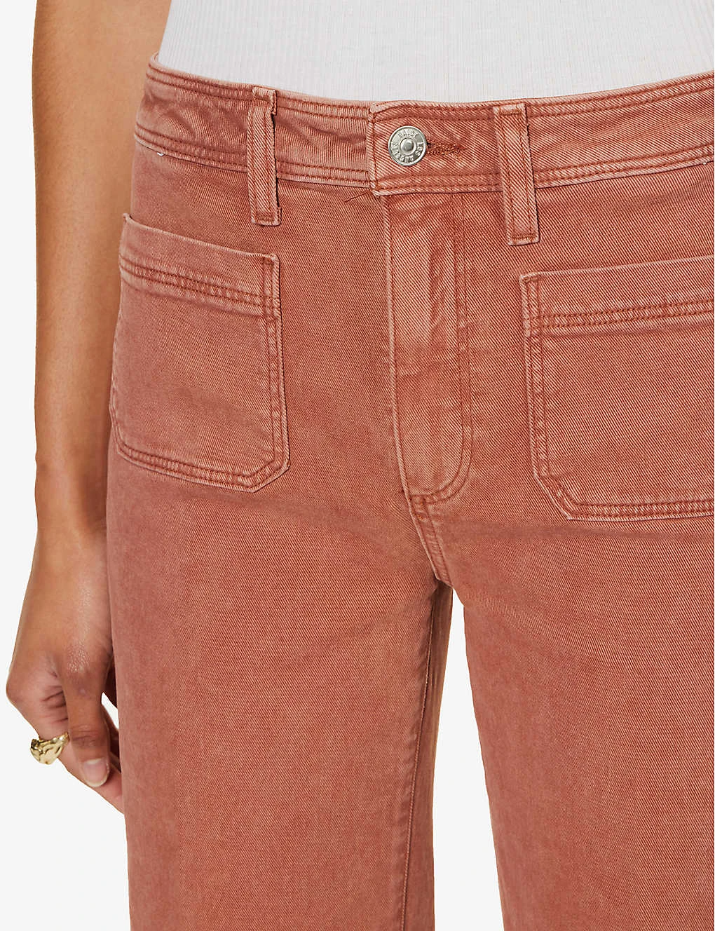 - Relaxed fit, mid-rise, wide flared leg, belt loops, branded hardware, two patch pockets, branded patch at back, darts at back, two welt pockets at back, centre pressed creases, faded wash, partially lined