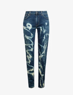 - Slim-fit, high-rise, skinny, belt loops, five pockets, branded hardware, all-over bleached dye print, debossed brand patch at back, V-shaped yoke at back, partially lined, embroidered brand tab at back