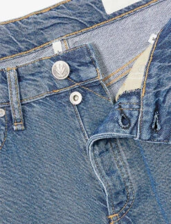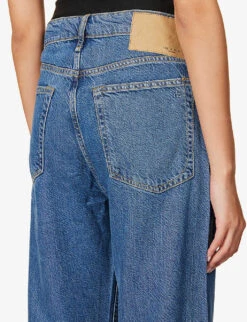 - Relaxed-fit, high-rise, wide leg, belt loops, five pockets, all-over faded wash, contrast stitching, branded silver-toned hardware, brand patch at back, V-shaped yoke at back