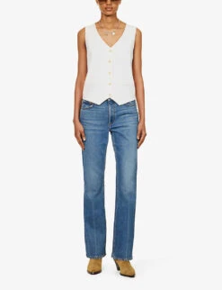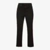 - Slim fit, mid-rise, flared leg, belt loops, five pockets, brand patch at back, contrast stitching, branded hardware, partially lined