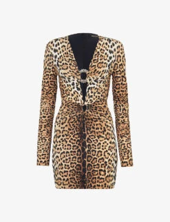 Roberto Cavalli Plunge-neck Leopard-print Woven Mini Dress