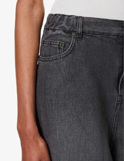 - Relaxed fit, mid-rise, wide leg, elasticated waistband with belt loops, five pockets, curved yoke at back, gold-toned hardware