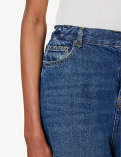 - Relaxed fit, mid-rise, wide leg, elasticated waistband with belt loops, five pockets, curved yoke at back, mid-wash, contrast stitching, gold-toned hardware