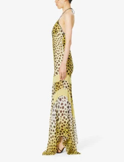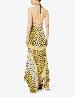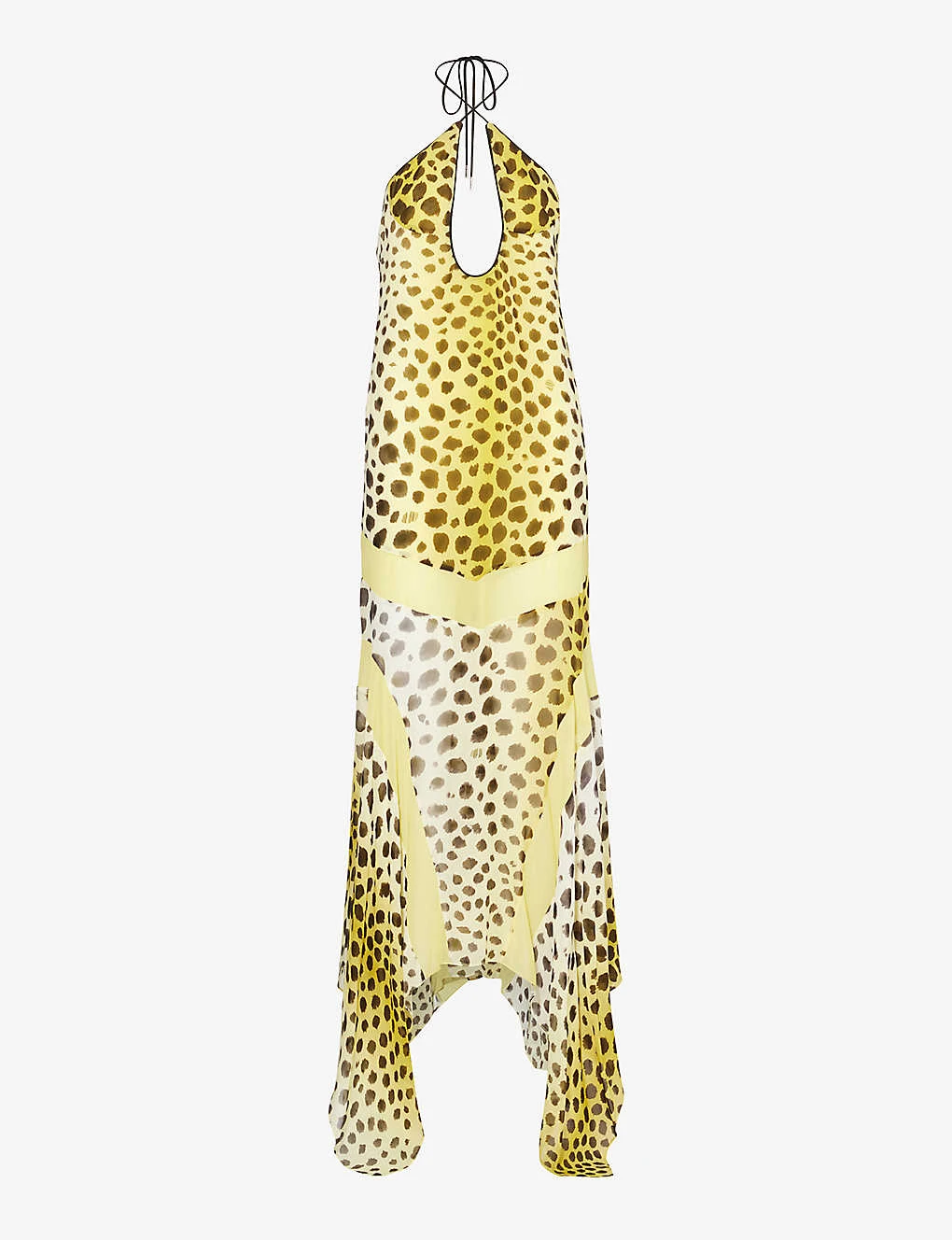 - Slim fit, halterneck, plunge neckline, sleeveless, open back, panelled abstract pattern, flared asymmetric hem