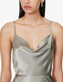 - Slim fit, cowl neck, adjustable shoulder straps, self-tie strap at back, satin texture