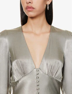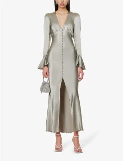 Be the first to review “Shona Joy Fluted-sleeve Rouleaux-button Satin Maxi Dress” Cancel reply