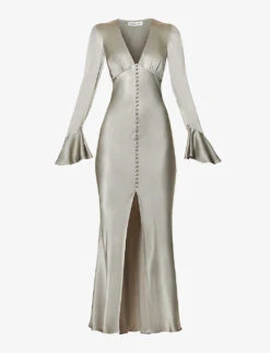 Be the first to review “Shona Joy Fluted-sleeve Rouleaux-button Satin Maxi Dress” Cancel reply