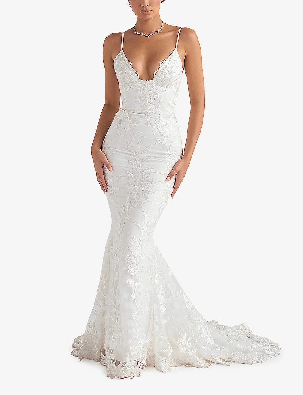 - Slim fit, sweetheart neckline, underwired cups, sleeveless, thin shoulder straps, corset bodice, train at back, all-over floral lace overlay, A-line silhouette, scallop hem