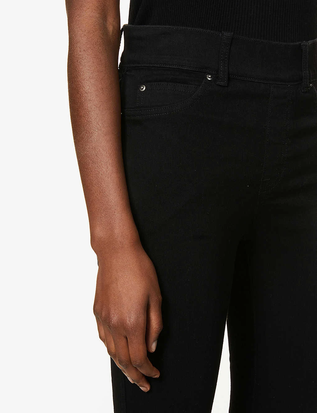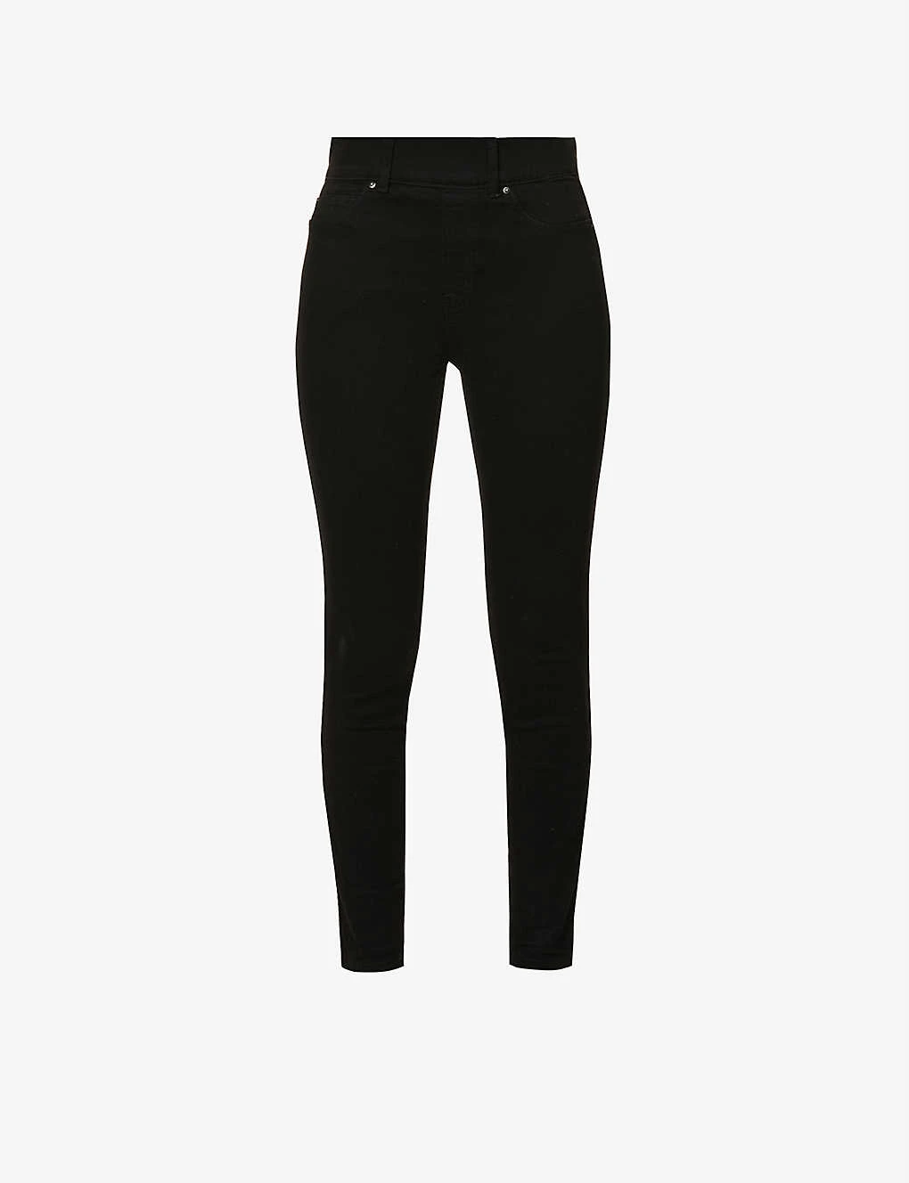 - High-rise, skinny leg, elasticated waistband, belt loops, three stitched slip pockets at front, v-shaped yoke at back, two patch pockets at back