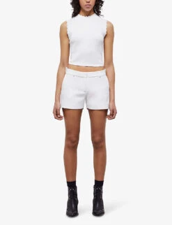 - Slim fit, round neck, sleeveless, cinched at waist, medium knit, flared hem, scalloped trims