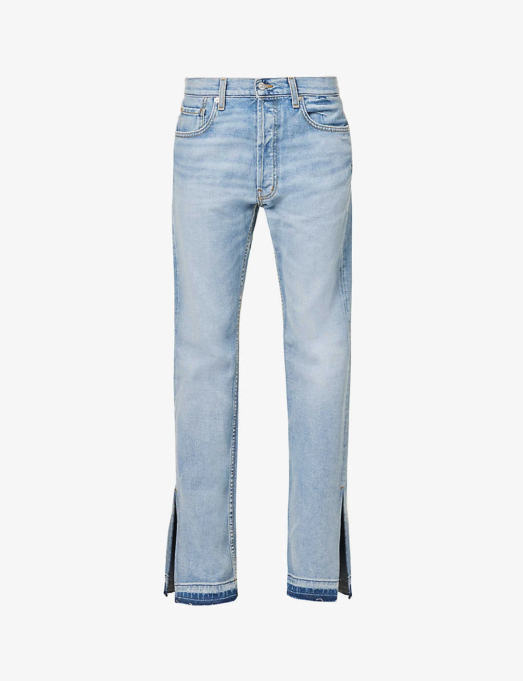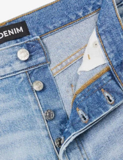 - Regular fit, mid-rise, straight leg, structured waistband with belt loops, five pockets, brand patch at back, V-shaped yoke at back, contrast stitching, faded wash, raw hems, branded silver-toned hardware