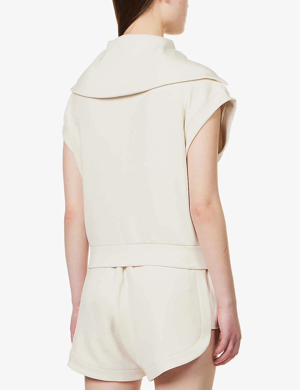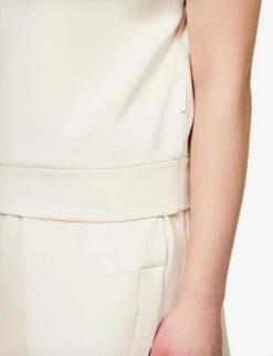 - Boxy-fit, round neck, capped sleeves, branded silver-toned hardware, draped panel at back, ribbed trims, embroidered brand tab at side seam