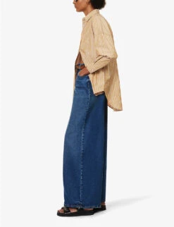 - Relaxed fit, high-rise, straight leg, belt loops, pleats at front, two slip pockets at front, darts at back, welt pocket at back, all-over pinstripe pattern
