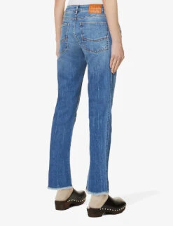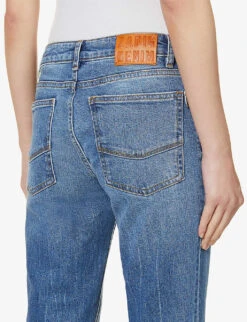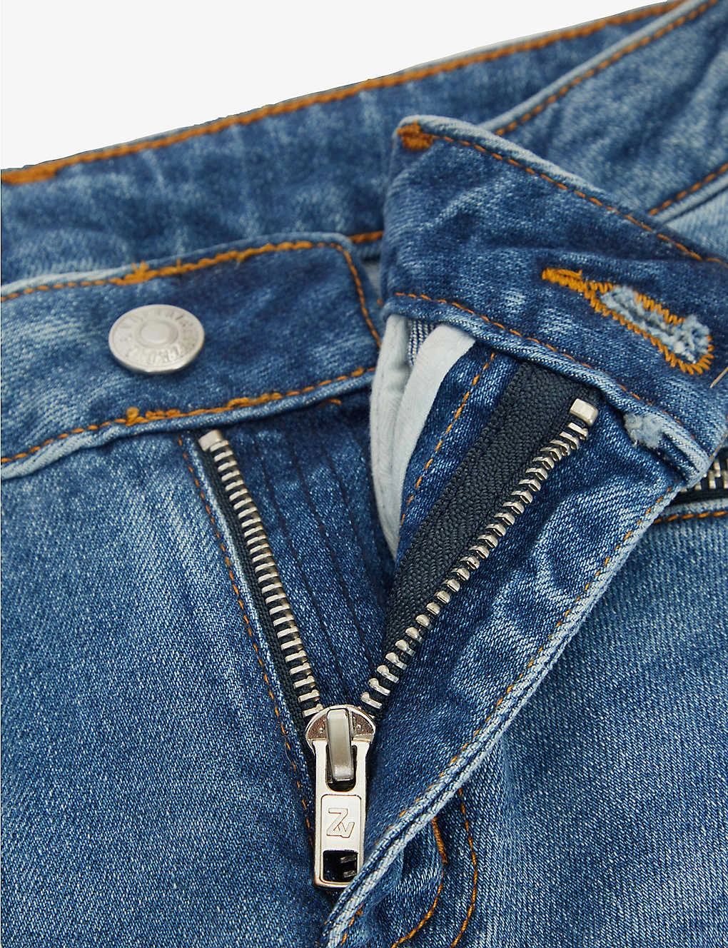 - Slim fit, mid-rise, straight leg, belt loops, faded wash and whiskering, zipped pockets at front, welt pocket at front, patch pockets at back, branded patch at back waistband, v-shaped yoke at back, frayed hems