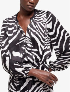 - Tassel-fastened V-neck, long sleeves, all-over zebra print, elasticated waistband, mini skirt